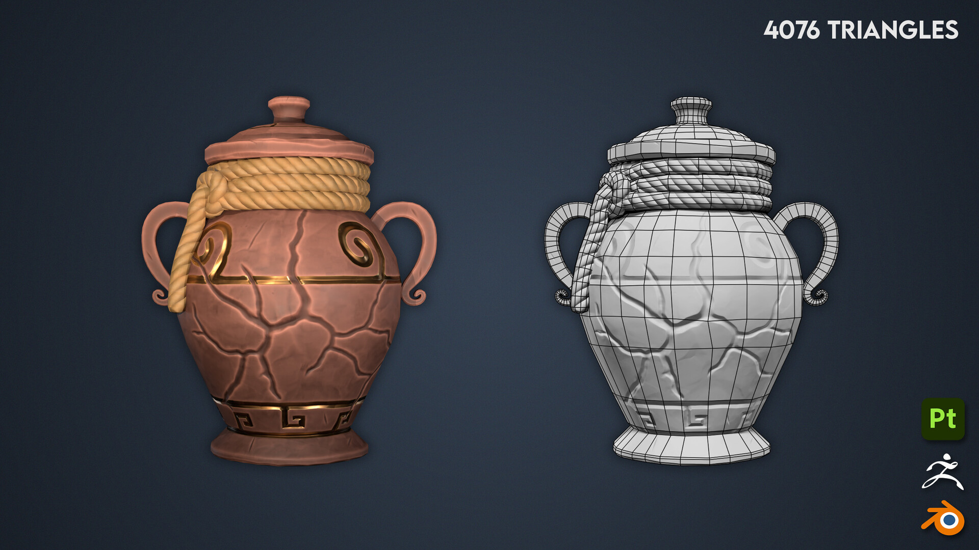 This pot was sculpted in ZBrush, with retopology done in Blender. I then textured it in Substance Painter, and the final render was done in Unreal Engine.